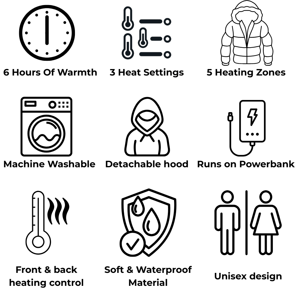 It’s a water- and windproof jacket with built-in heating zones powered by a powerbank. Just press the button and enjoy instant warmth, whether you're hiking, camping or heading out on a chilly morning.